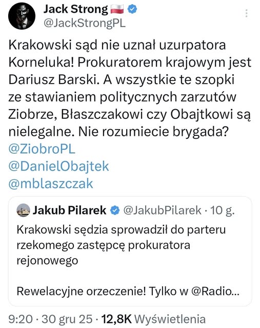 Tym razem, 29 grudnia 2025 r., krakowski Sędzia Sądu Okręgowego Jędrzej Dessoulavy-Śliwiński nie dopuścił do uczestniczenia w procedurze sądowej Macieja Płeszkę powołanego przez bezprawnie mianowanego na Prokuratora Krajowego Jacka Bilewicza (jeszcze przez Bodnara, decyzję podtrzymał Żurek)