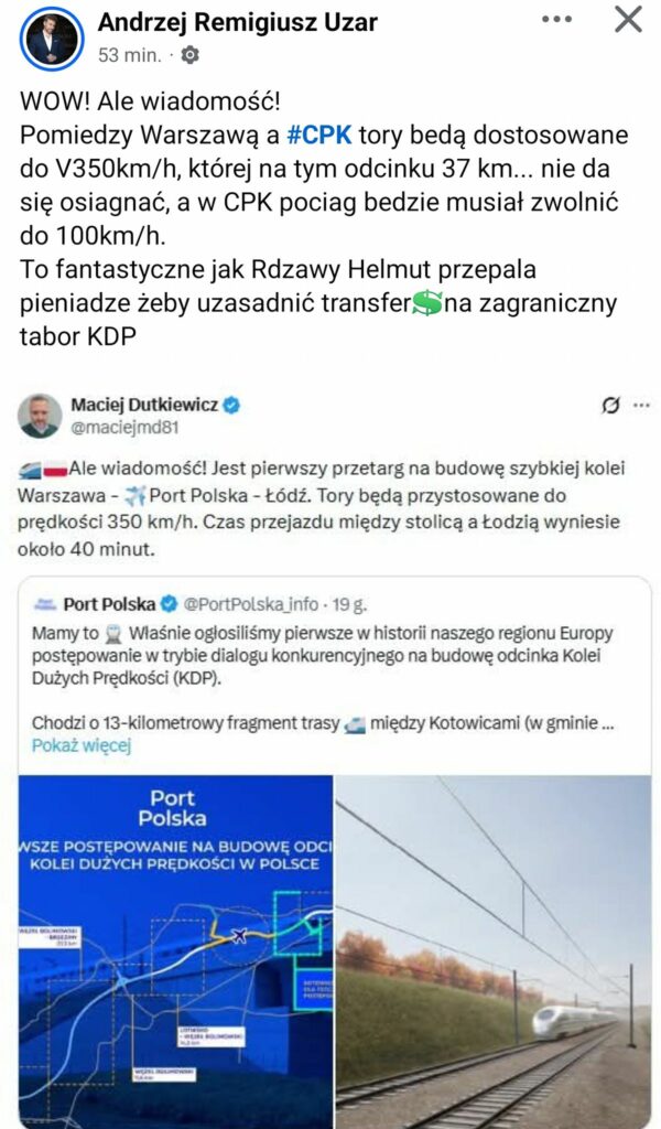 Przy okazji – 320 km/h na odcinku Warszawa – Łódź czy Łódź – Port Polska (zamiast CPK) jest prędkością niemożliwą do osiągnięcia (przy warunkach rozpędzania składu i drogi hamowania). Jest to tylko jeden, ale dobitny dowód, że warunki przetargu zostały skonstruowane wyłącznie w celu zablokowania polskich producentów oraz zapewnienia wygranej przez niemieckich producentów.