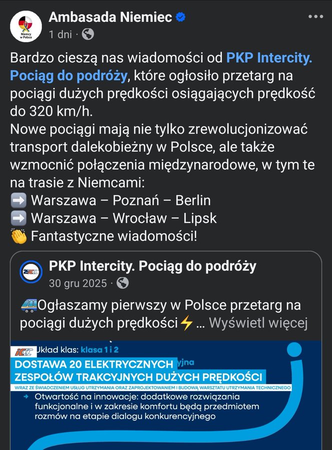 Niemiecki ambasador ucieszył się, że Polska tak zmieniła warunki przetargu na pociągi (z 200, 250 km/h na 300, 320 km/h) – że jednym ruchem wyeliminowała wszystkich polskich wykonawców, a tą sama decyzją wskazałą, że zgłaszać się mogą wyłacznie niemieckie firmy.