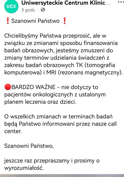 Tymczasem Uniwersyteckie Centrum Kliniczne w Gdańsku przeprasza, że ze względu na cofnięte przez rząd finansowanie muszą ograniczyć Tomografię Komputerową (TK) i Rezonans Magnetyczny (MRI) do minimum, jedynie dla dzieci i chorych onkologicznie.